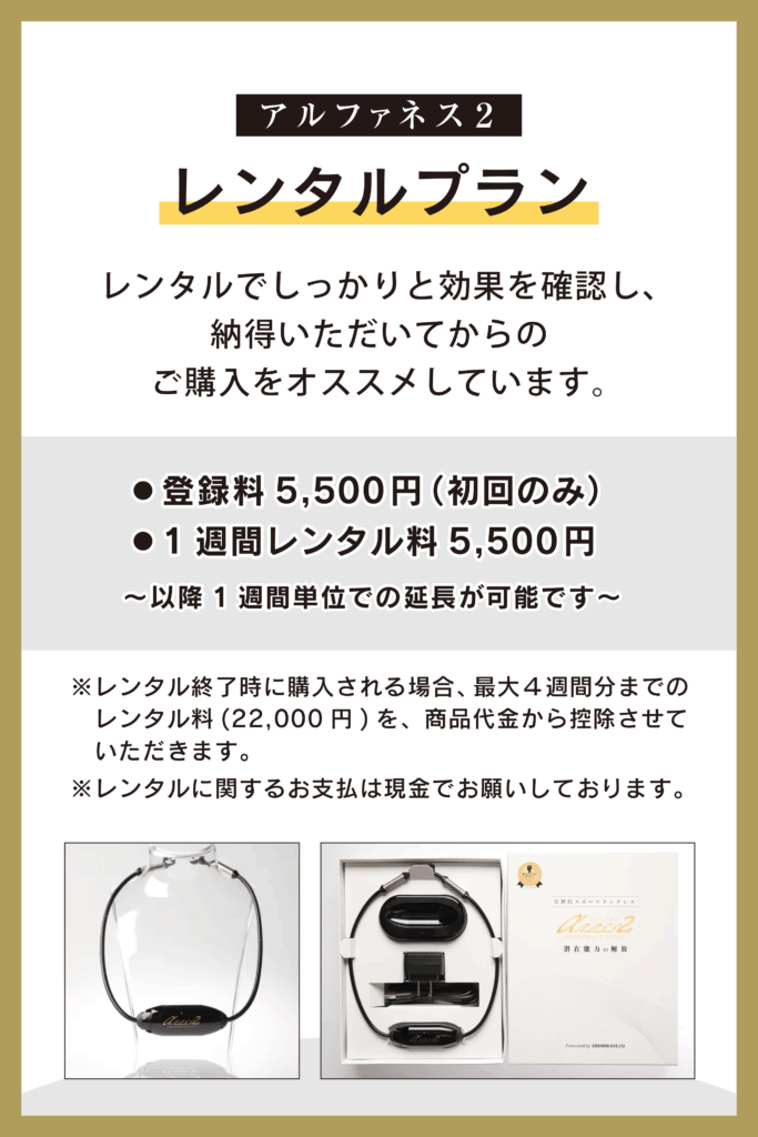 アルファネス2はレンタルにも対応しています。使用感や効果を確認してからご購入を考えたい、という方はぜひご活用ください。