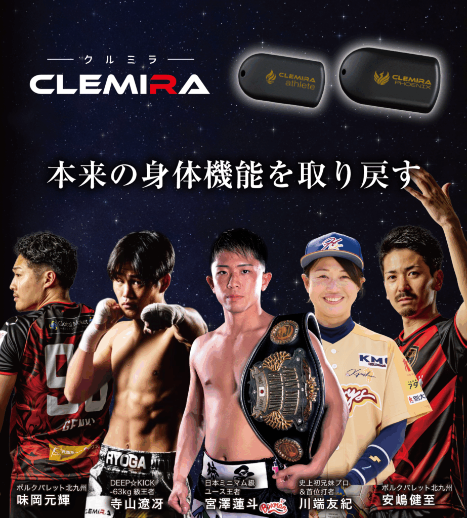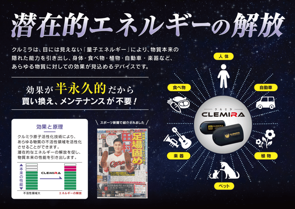 デバイスの中には独自技術の “CLEMIRA CORE TECHNOLOGY” を施したコアが封入されており、そのコアが発する”目には見えない量子のふるまい”によってあらゆる物質が活性化されると考えられています。触れたり近づけたりした物にエネルギーを与え、身体や食べ物、植物、自動車など様々な物質への効果が得られます。